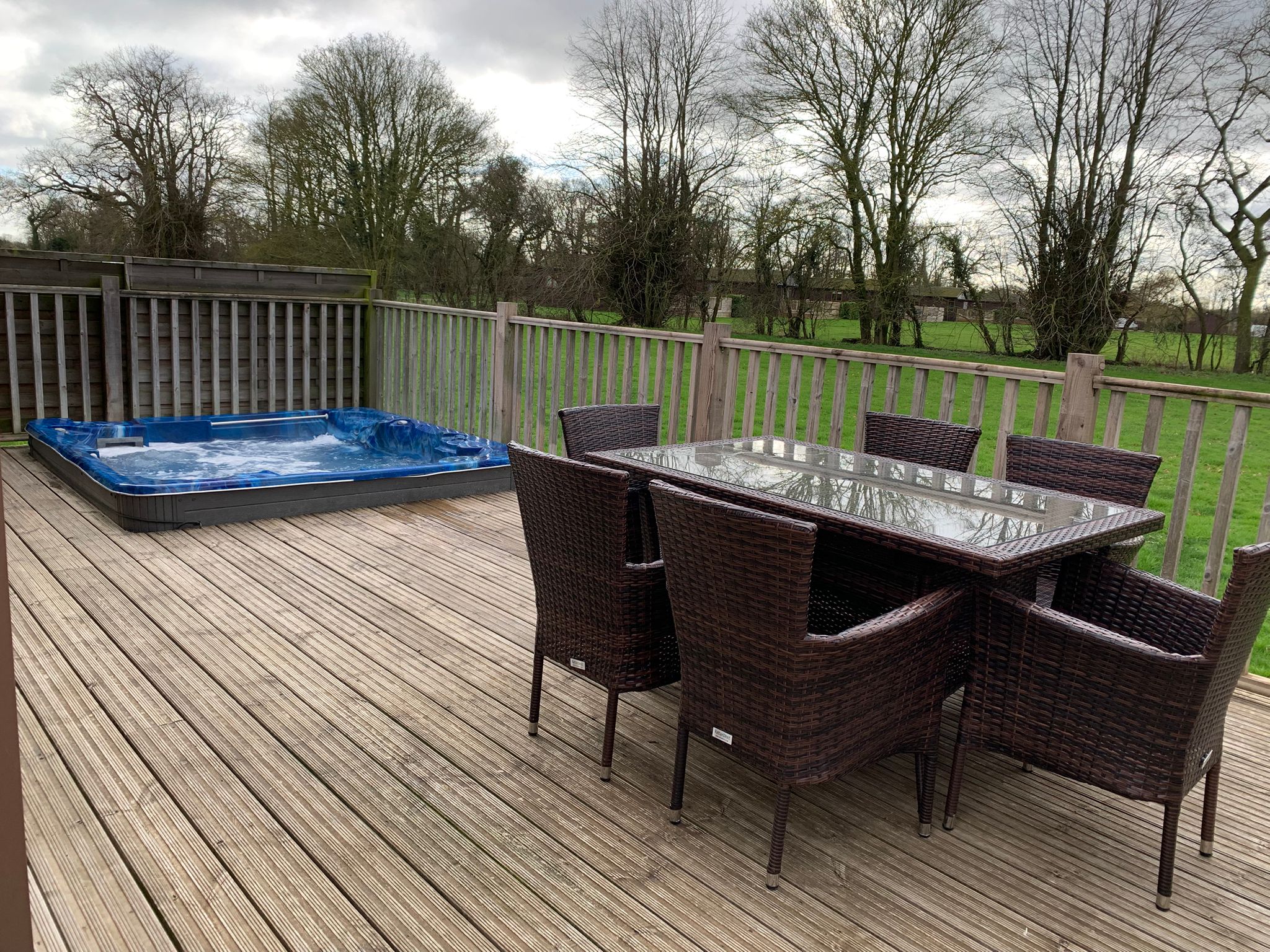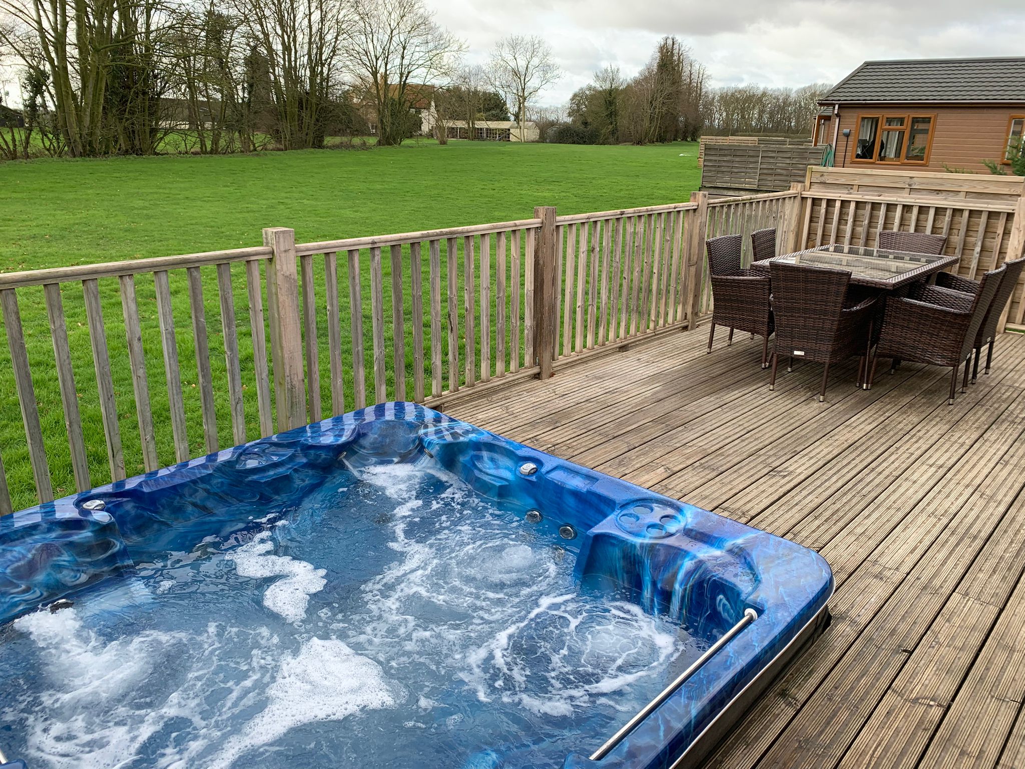We have 2 two bedroom lodges all beautifully decorated, sauna in the bathroom, hot tub sunken into the veranda, walk in shower and coffee maker. They have space in abundance inside the lodge and out, lawned area to the front and stunning views behind. Believe us, you will want to move in to this one.
